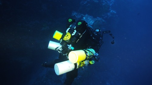 Lance Robb wearing his deep dive rebreather rig ready to ascend.